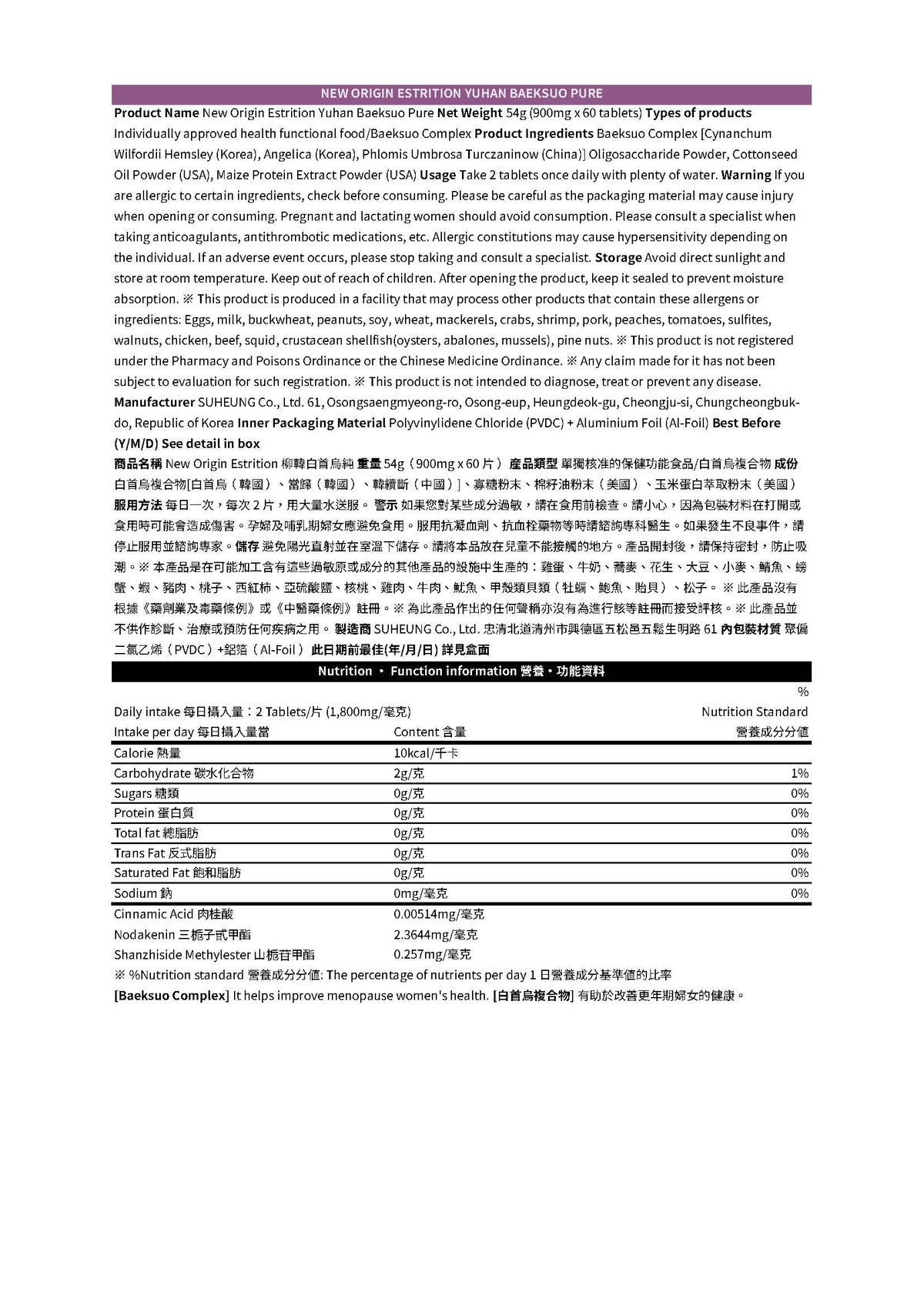 Korea YUHAN CARE Estrition Baeksuo Pure (60 pills)