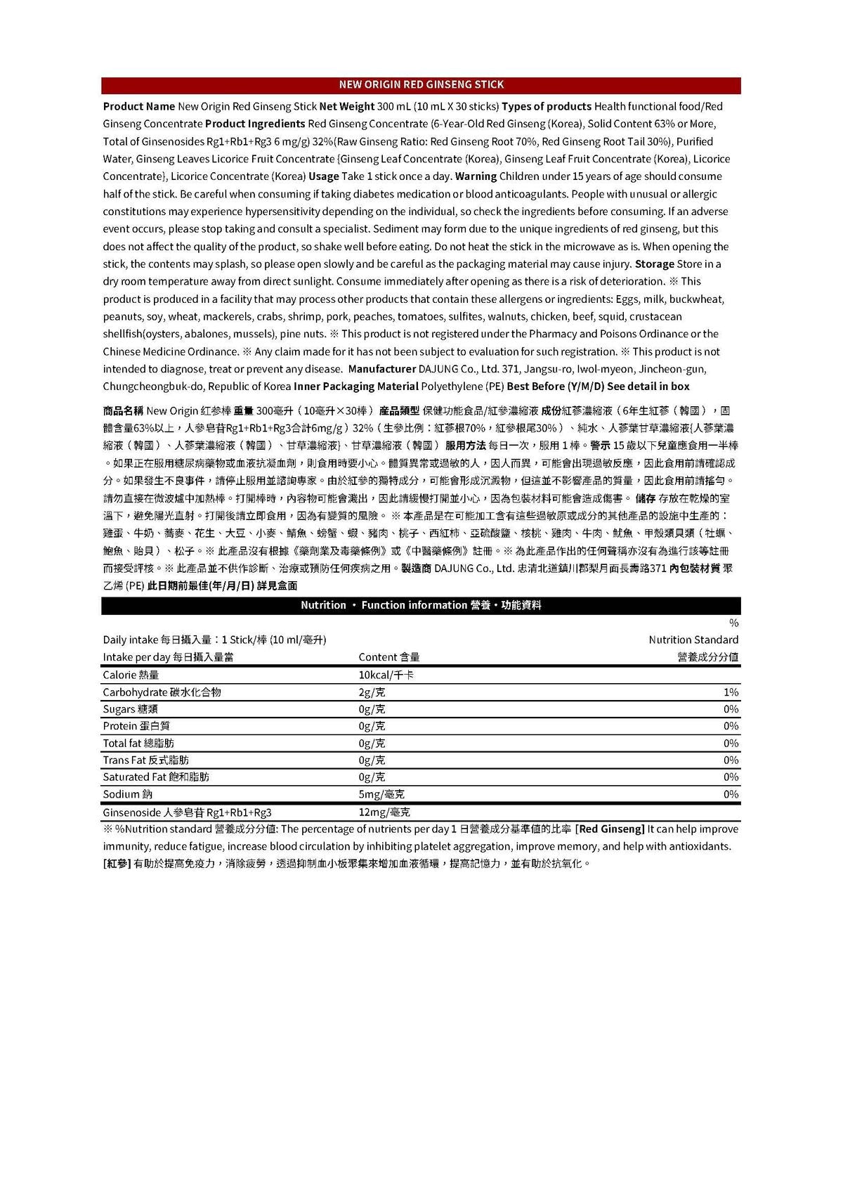 New Origin Whole Red Ginseng Stick: is the original red ginseng stick, a product that allows you to feel the rich taste of red ginseng, with 12mg of red ginseng ingredients (ginsenosides)